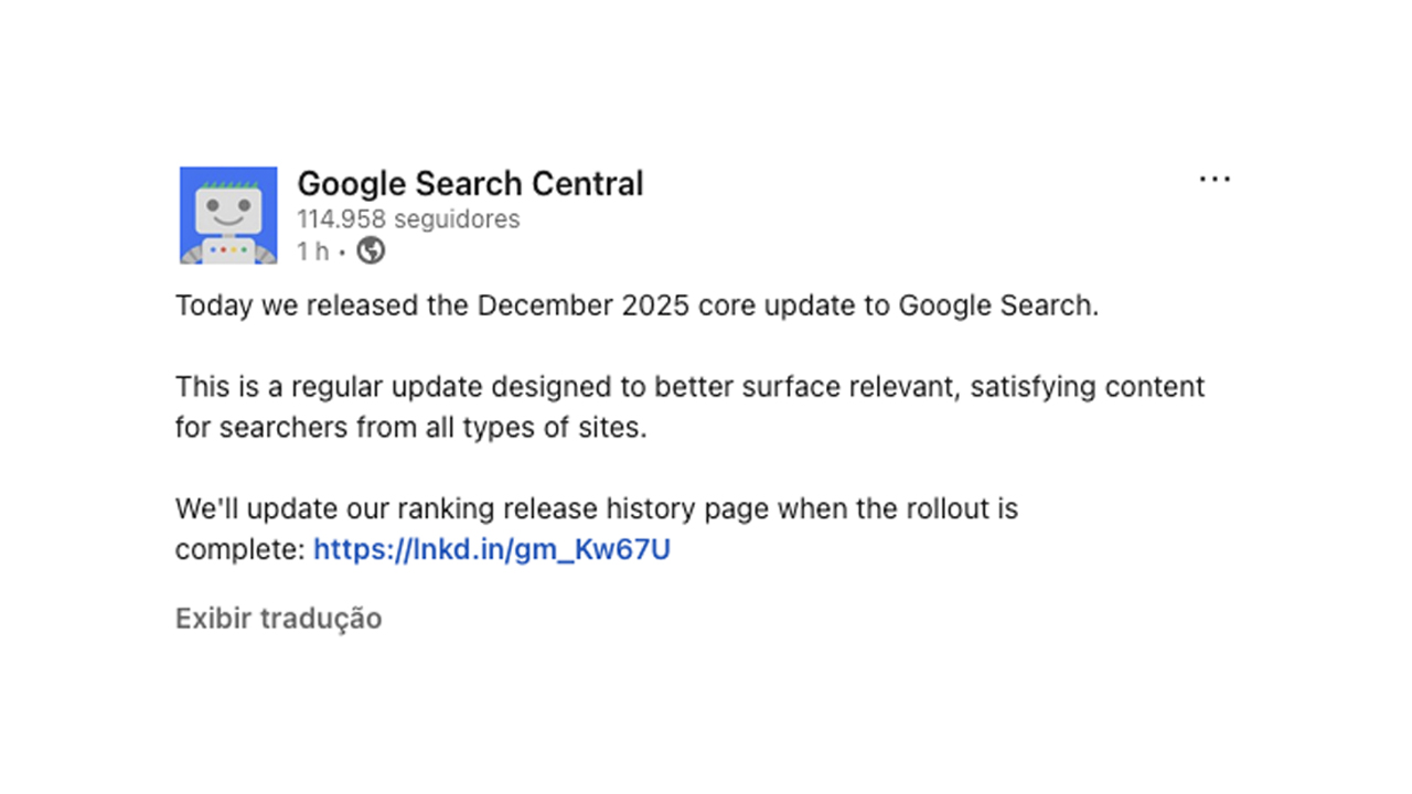 O Core Update de Dezembro de 2025 reforça o compromisso do Google com a entrega de conteúdos úteis e relevantes para seus usuários. É a sétima atualização seguida com foco na promoção desse tipo de conteúdo.
