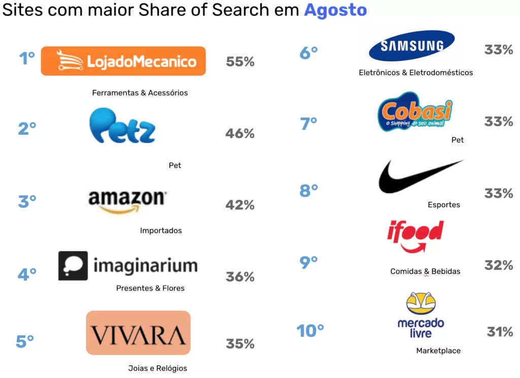 Nos dados gerais de Share of Search, Loja do Mecânico segue sendo o líder da indústria seguido por Petz e Amazon, com 42% do SoS.
