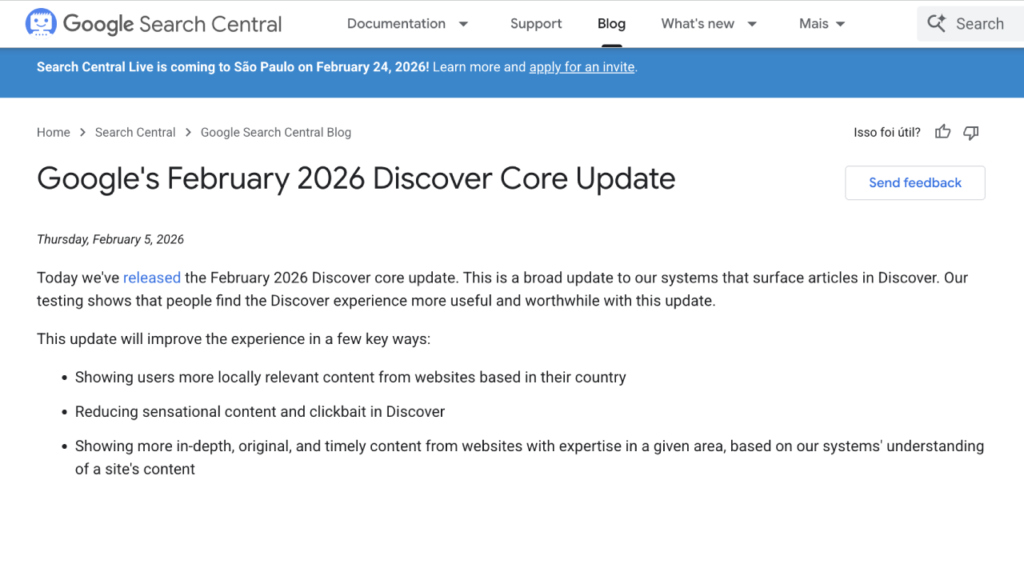 O Google anunciou oficialmente a atualização em fevereiro de 2026, destacando que esta é a primeira vez que um Core Update é direcionado especificamente ao Discover.