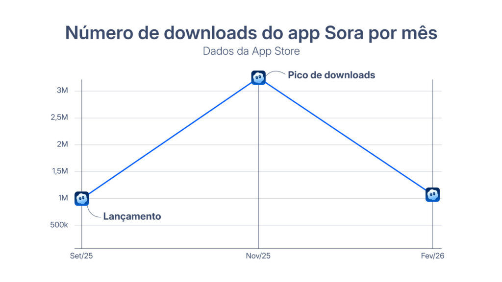 O pico de downloads ocorreu em novembro de 2025, quando o app registrou 3,3 milhões de downloads no mês. No entanto, o engajamento caiu rapidamente — em fevereiro de 2026, os downloads haviam recuado para 1,1 milhão, uma redução de 67% em relação ao pico.