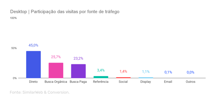A participação em nosso relatório e rankings é feita a partir do volume estimado de audiência dos sites, conforme metodologia que apresentamos. A audiência, por sua vez, é composta de canais de tráfego que enviam visitantes para cada e-commerce. A principal forma de entrada é o chamado “tráfego direto”, que acontece quando o consumidor digita o endereço da loja diretamente no navegador.