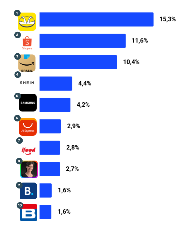 O Mercado Livre mantém a liderança do e-commerce brasileiro com 15,3% de participação de mercado. A Shopee ocupa a segunda posição com 11,6%, seguida pela Amazon Brasil com 10,4%. A Shein detém 4,4% de share. As 10 maiores lojas concentram 57,5% da audiência total do setor.